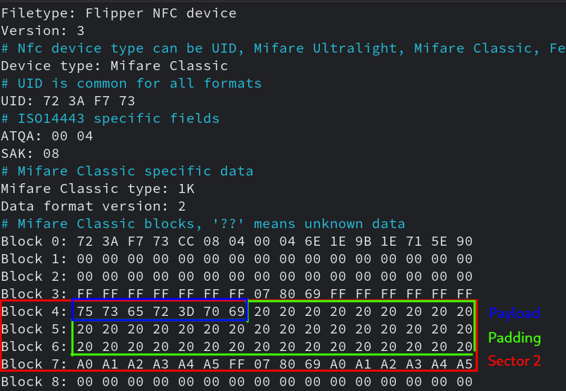Currently, the executed bash command looks like this: groups pi. By modifying the NFC tag, we can change user=pi to whatever we want with modify sector 2 on Mifare tag, for example: ;cat flag.txt to create bash command like groups;cat flag.txt, which would display the contents of flag.txt.