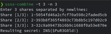 Now that we have the three parts of the flag, we use an algorithm called Shamir Secret Sharing and a tool called ssss on Linux to combine the three flags we can guess it with the firmware code source.